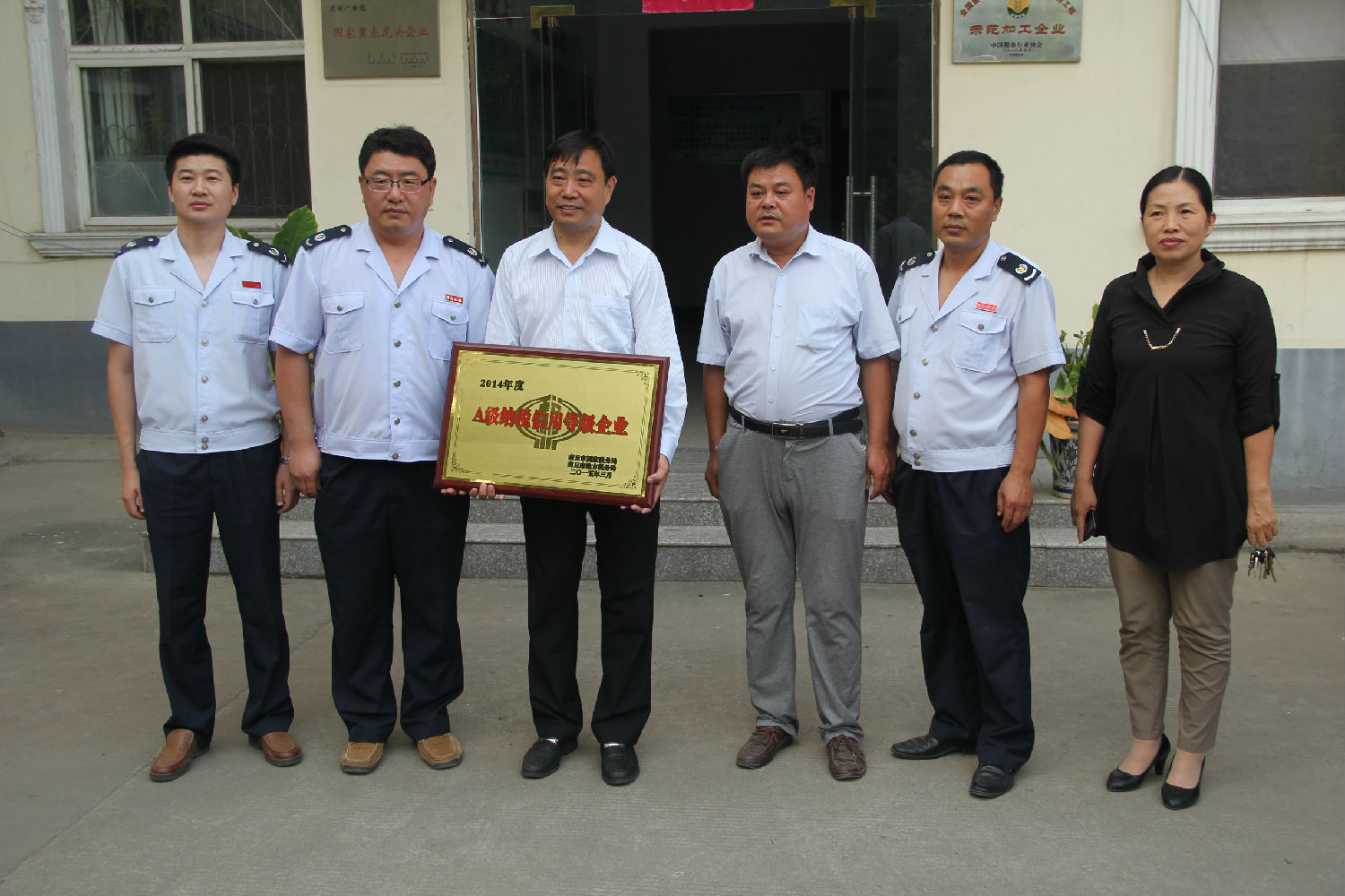 近日,商丘市经济开发区国家税务局下发了2014年度纳税人纳税信用等级评定结果,河南诚实人实业集团有限责任公司被评定为A级纳税信用等级企业。9月15日,商丘市经济开发区国家税务局牛有德副局长(左一)等一行3人来到河南诚实人实业集团有限责任公司,对公司依法履行纳税工作给予充分肯定,对公司被评为A级纳税信用等级企业表示衷心祝贺,并向公司宋肃远董事长颁发了“2014年度A级纳税信用等级企业”牌匾。图为宋肃远董事长与牛局长一行合照留念。
